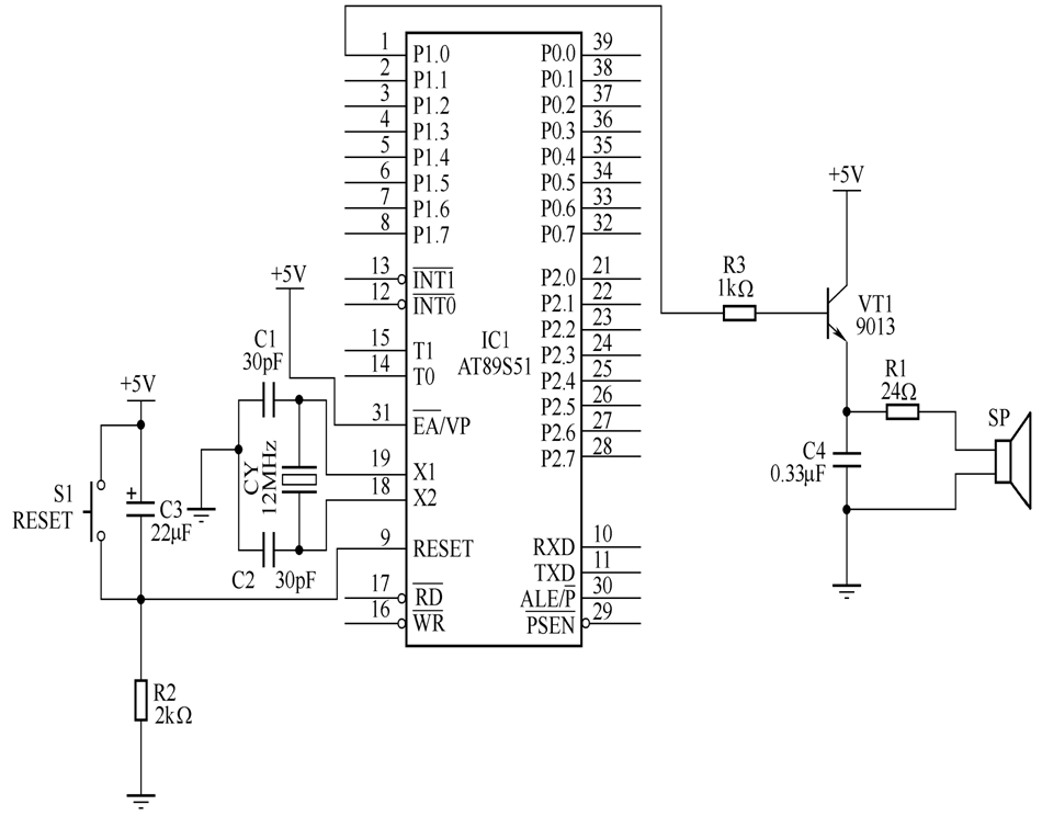 单片机的 P1.0 驱动扬声器发出不同频率、不同长短的声音。