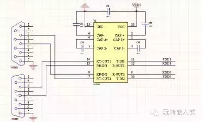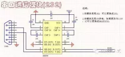 双路232通信电路:3线连接方式,对应的是母头,工作电压5V,可以使用MAX202或MAX232。