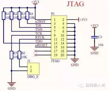 上图中JTAG接口都通过电阻上拉了,有的单片机的这几个引脚在内部已经上拉,所以这几个上拉电阻可以省略,减少了成本和PCB空间的占用。