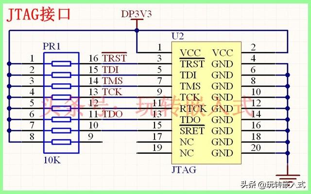 TDI--数据输入 ,所有写入寄存器的数据都是通过TDI接口串行输入的;TMS--模式选择 ,Jlink输出给目标CPU的时钟信号;TCK--时钟信号 ,所有数据的输入输出都是以该时钟信号为基准的;TDO--数据输出 ,所有从寄存器读出的数据都是通过TDO接口串行输出的;以上这四个引脚都是协议里强制要求的,而且协议建议在设计电路时要选用上拉电阻。JTAG接口有多种形式,常用的20引脚、14引脚和10引脚。以20引脚JTAG为例,所设计的JTAG烧写电路如下图所示: