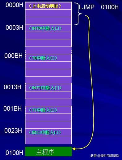 ②必须是“跳转指令”以跳过下面的5个中断矢量,转到后面的真正的主程序入口0100H单元。
