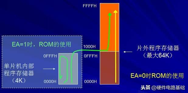 5.如果EA=1(执行片内程序存储器中程序时):如果程序计数器的指针PC值超过0FFFH(4K)时,单片机就要自动的转向片外的ROM存储器且从1000H单元开始执行程序(无法使用片外ROM的低4K空间)。