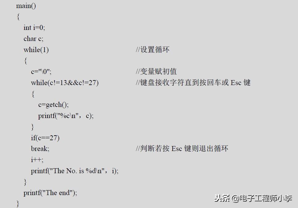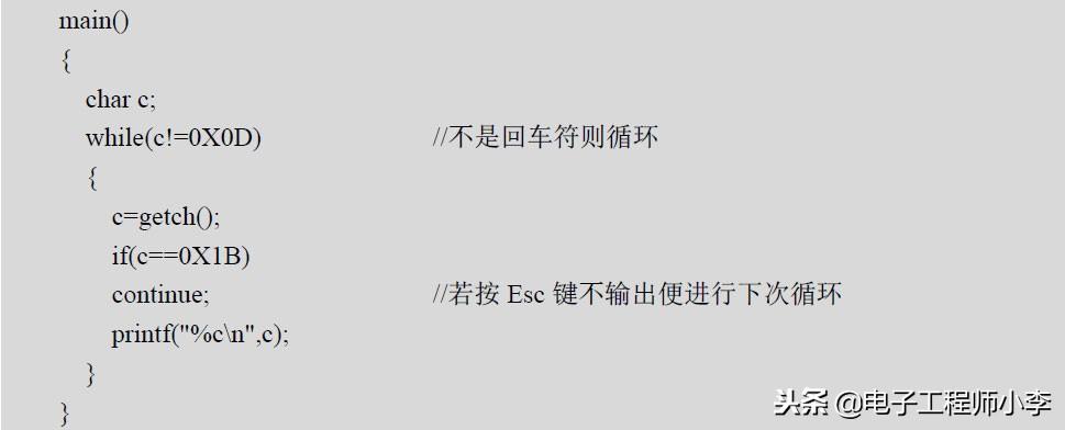上例中,while循环是以检查c是否为回车符开始,因其事先被初始化为空,所以条件为真,进入循环等待键盘输入字符;一旦输入回车,则c=''\X0D'',条件为假,循环便告结束。