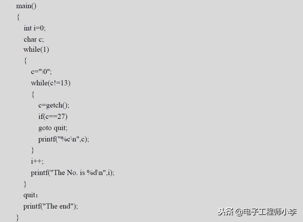 其中标号是一个有效的标识符,这个标识符加上一个“:”一起出现在函数内某处,执行goto语句后,程序将跳转到该标号处并执行其后的语句。另外标号必须与goto语句同处于一个函数中,但可以不在一个循环层中。通常goto语句与if条件语句连用,当满足某一条件时,程序跳到标号处运行。