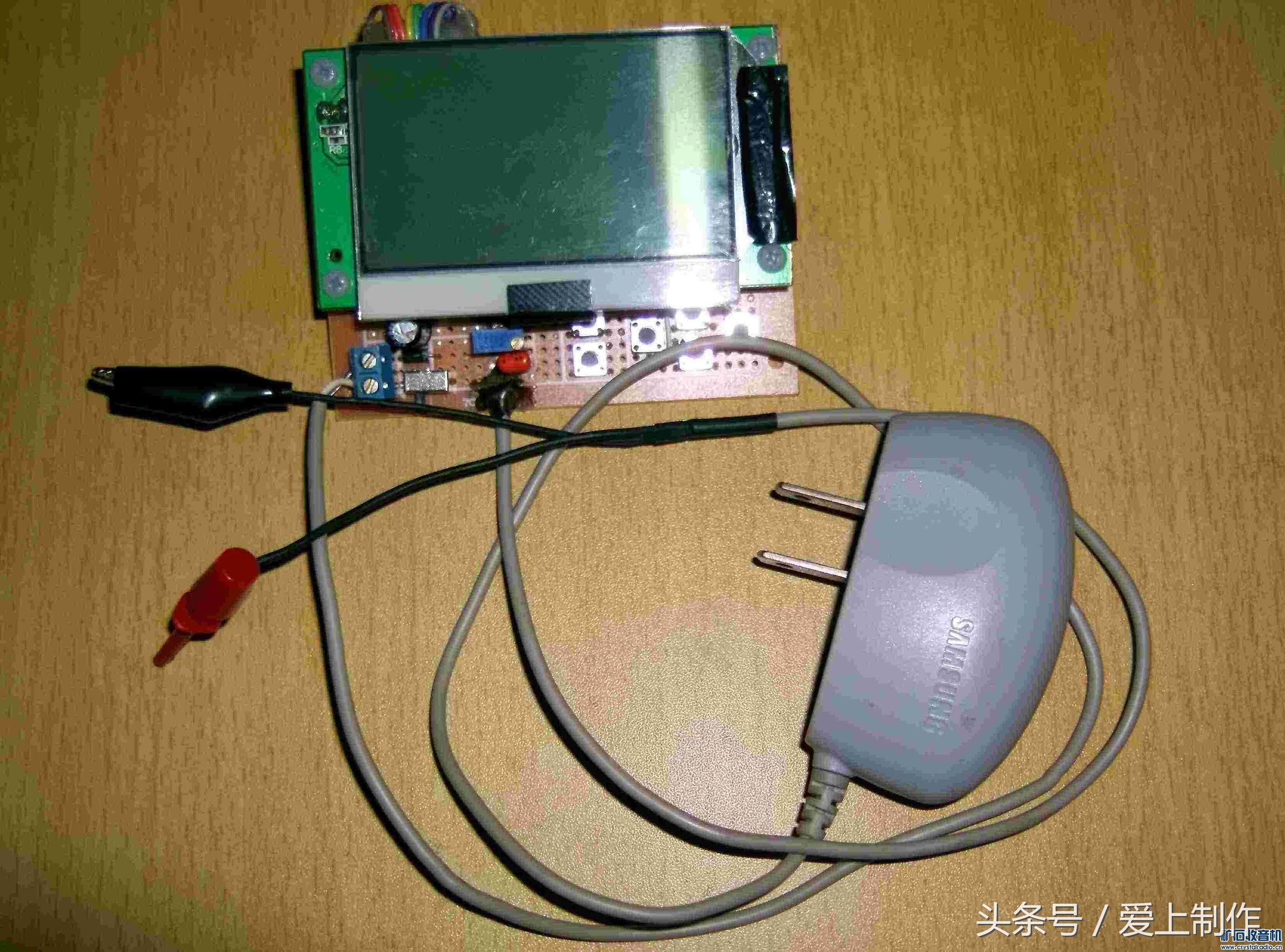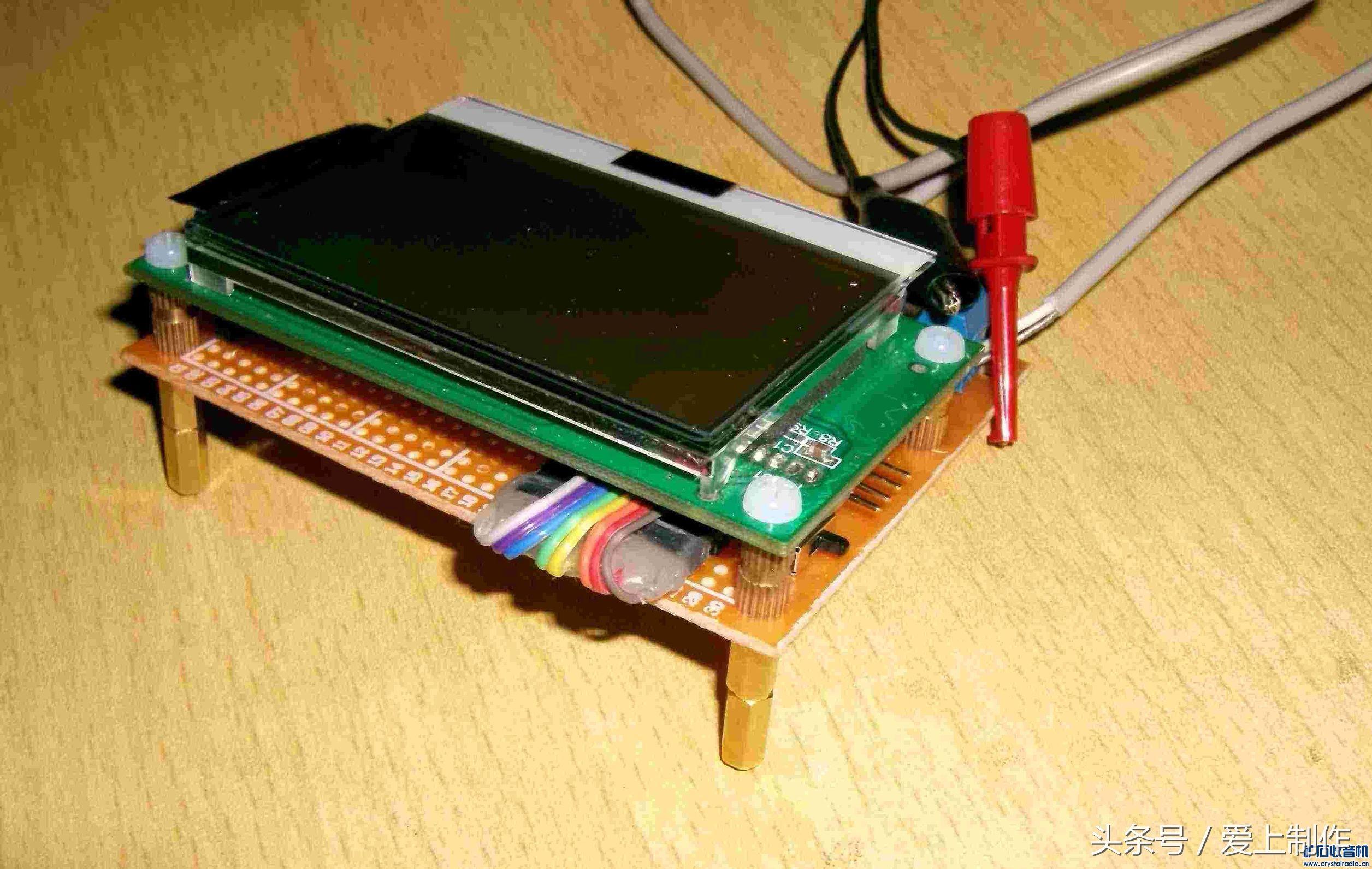 用旧的手机充电器供电,直流5V,示波器探头就是用两个鳄鱼夹,显示屏刚好用铜柱放在电路板上面,节约空间