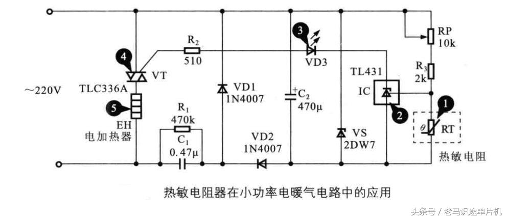 下图是热敏电阻在小功率电暖气电路中的应用。