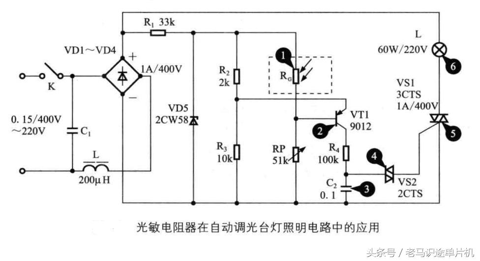 下图是光敏电阻在自动调光台灯照明电路中的应用,该电路选用光敏电阻作为感知光控元件,当光敏电阻器RG感受外界环境光照强度不同时,其体现到电路中的电阻值也发生变化,从而使三极管VT1的基极获得不同的电压值,则经该三极管放大后由集电极输出的电压值也相应发生改变。环境光变暗时,光敏电阻RG的阻值增加,使VT1基极与发射极之间变成正向偏置,VT1导通,集电极输出电流为电容器C2充电,C2的电压上升,双向晶闸管VS2导通,触发双向晶闸管VS1导通,L灯发光。