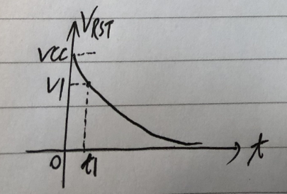 下图是 RST 电压随时间 t 的变化曲线,在 0~t1 时间内,单片机是复位状态,随着 RST 上电压降低,单片机进入正常工作状态,最后 RST 变为 0V。