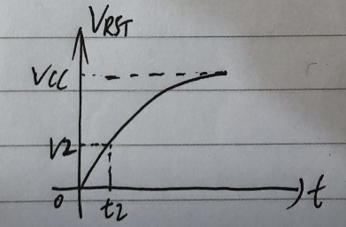 下图是 RST 电压随时间变化的曲线,0~t2 时间内,单片机是复位状态,随着 RST 电压升高,单片机进入正常工作状态,最后 RST 电压等于 VCC。