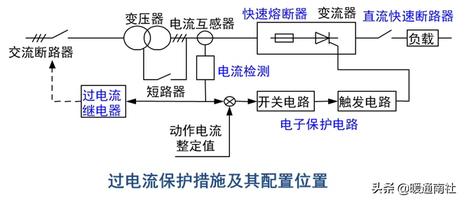 电子电路作为第一保护措施,快熔仅作为短路时的部分区段的保护,直流快速断路器整定在电子电路动作之后实现保护,过电流继电器整定在过载时动作。