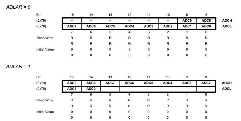 ADC转换结束后,转换结果将存在这两个寄存器当中。首先ADMUX寄存器当中的ADLAR和MUXn影响转换结果在寄存器中的存放形式。当ADCL被读取时,ADC数据寄存器在读取ADCH之前不会更新,如果转换结果为左对齐且只需要8位的精度,那么仅需要读取ADCH就可以了,否则需先读取ADCL然后读取ADCH。