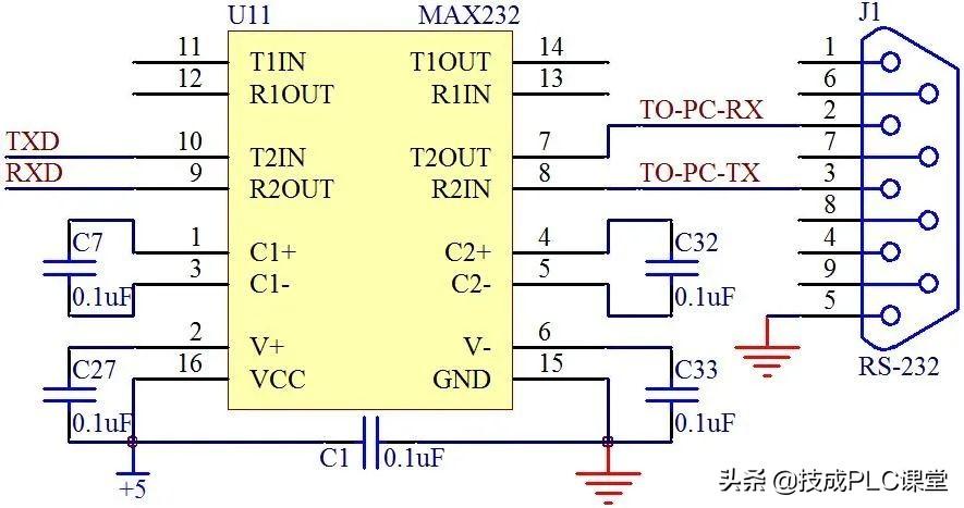 单片机接口一般是TTL电平,如果接232电平的外设,就需要加TTL转RS232的模块。如下图,可用芯片MAX232进行转换。
