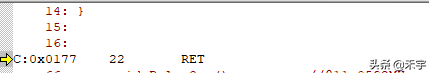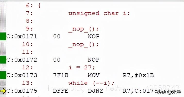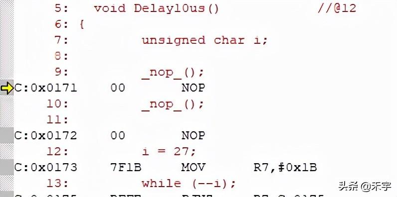 程序成功转移到C:0171行,跳转到Delay10us函数中,此行程序执行NOP指令,空操作。查STC数据手册,NOP指令占用1个时钟周期。