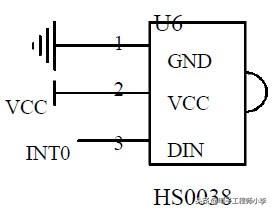 单片机与一体化红外接收头HS0038的引脚连接如图4-7所示,单片机与发光二极管的连接可以参照本章之前案例中的硬件电路图,这里省略未画出。