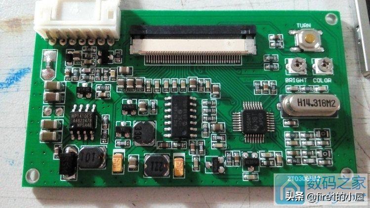 驱动板上有三个芯片,最左侧的是电源IC,用的MPS的芯片,最大输入24V,输出3.3V供整个板子和屏幕工作,中间SOP封装的是个单片机,是控制图像自动翻转和两路信号切换的,最右侧的是一个LCD专用驱动芯片。屏是AUO的。