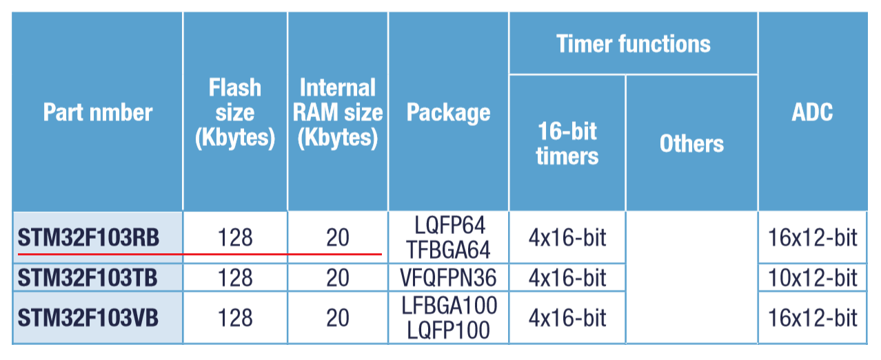 如下图所示是STM32F103RB系列单片机所使用的存储器大小,Flash为128KB,RAM为20KB,这里的RAM是指SRAM。