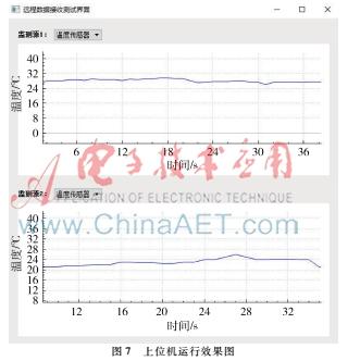 图7展示了上位机远程监测两台下位机数据的运行效果,从当前图中可以清楚地看出两个监测地点的温度随时间的变化情况,通过组合框可以切换监测源的监测对象。上位机界面中包括两路通道,分别接收两个下位机上传的数据,多路数据监测界面的设计原理与其相同,只需按要求实例ReceivedData类对象就可以完成指定数量下位机的数据监测。