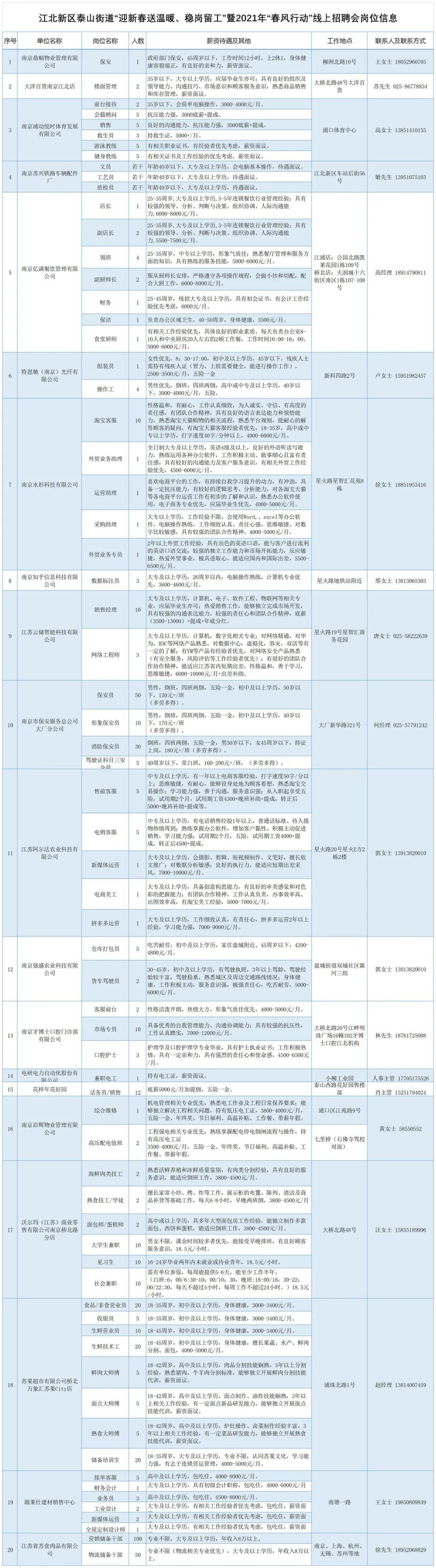 为有效促进稳岗就业,江北新区泰山街道积极开展“迎新春送温暖、稳岗留工”专项行动暨2021年“春风行动”线上招聘会,现将岗位信息发布。