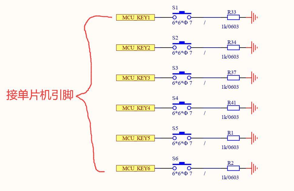 电路非常简单,就几个按键串上电阻接了单片机引脚,按键按下就会有一个低电平的信号给到单片机,单片机就是通过检测对应引脚是否低电平来判断按键是否按下。