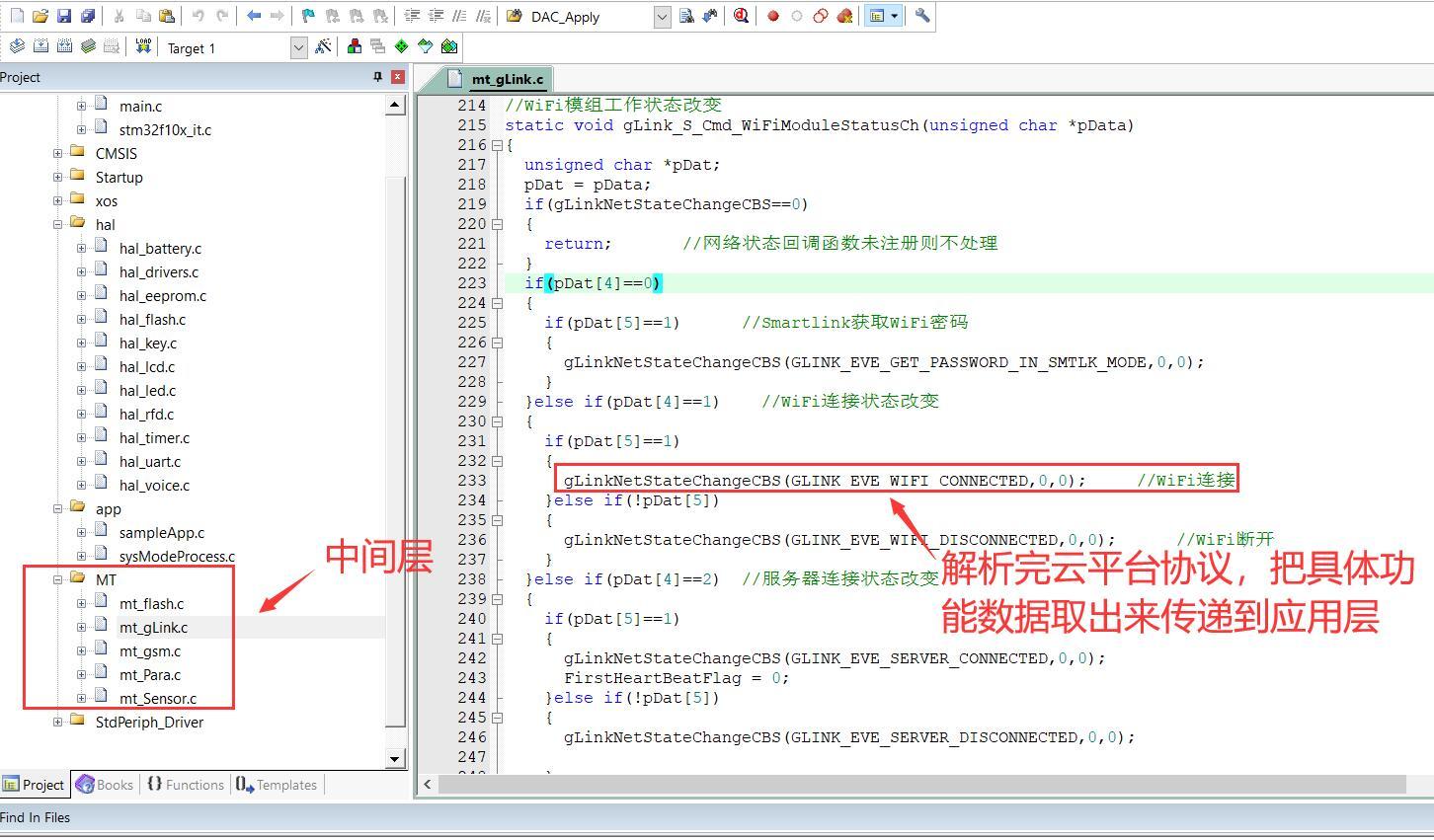 上图就是对云平台协议进行解析,比如说解析wifi是否连接的命令的程序,相对应用层来说,我们只需要”wifi已连接 ”和”wifi未连接 ”这两个明确的数据,而不做具体解析程序。