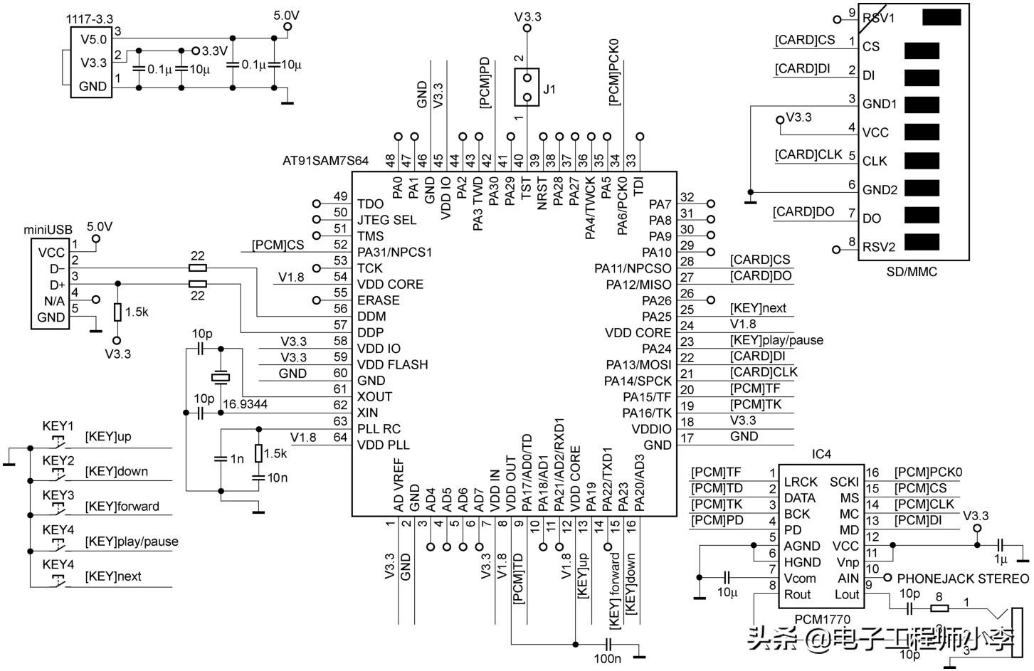 这个制作完成后,将CD音质的WAV文件复制到SD卡内,文件必须存放在根目录下。程序通过AT91SAM7S64的SSC串行控制器,把音频的数据流通过SSC接口传输到TI的音频DAC上。这样,耳机就播放出动听的音乐了。播放器使用普通的微动按钮控制,一共用了5个按钮,分别实现音量、选曲、播放、暂停等控制。