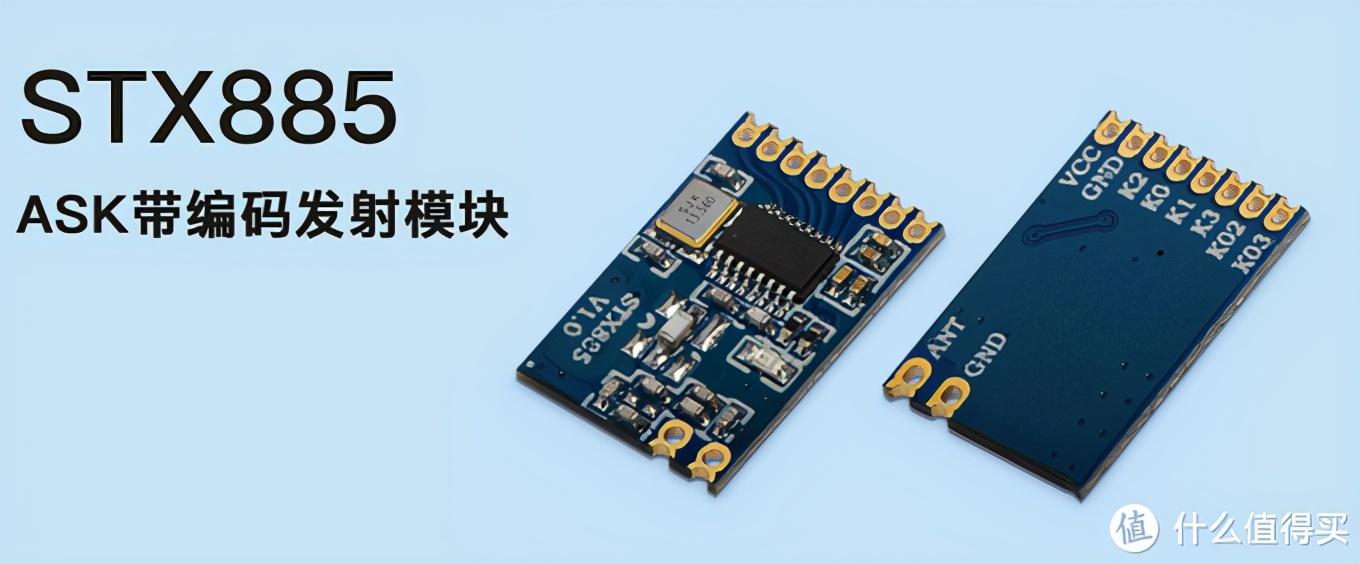 与接收模块配套的 STX885 是一款 ASK 带编码发射模块, 内含 ev1527 数字编码电路 ,支持 6 个按键输入。▲