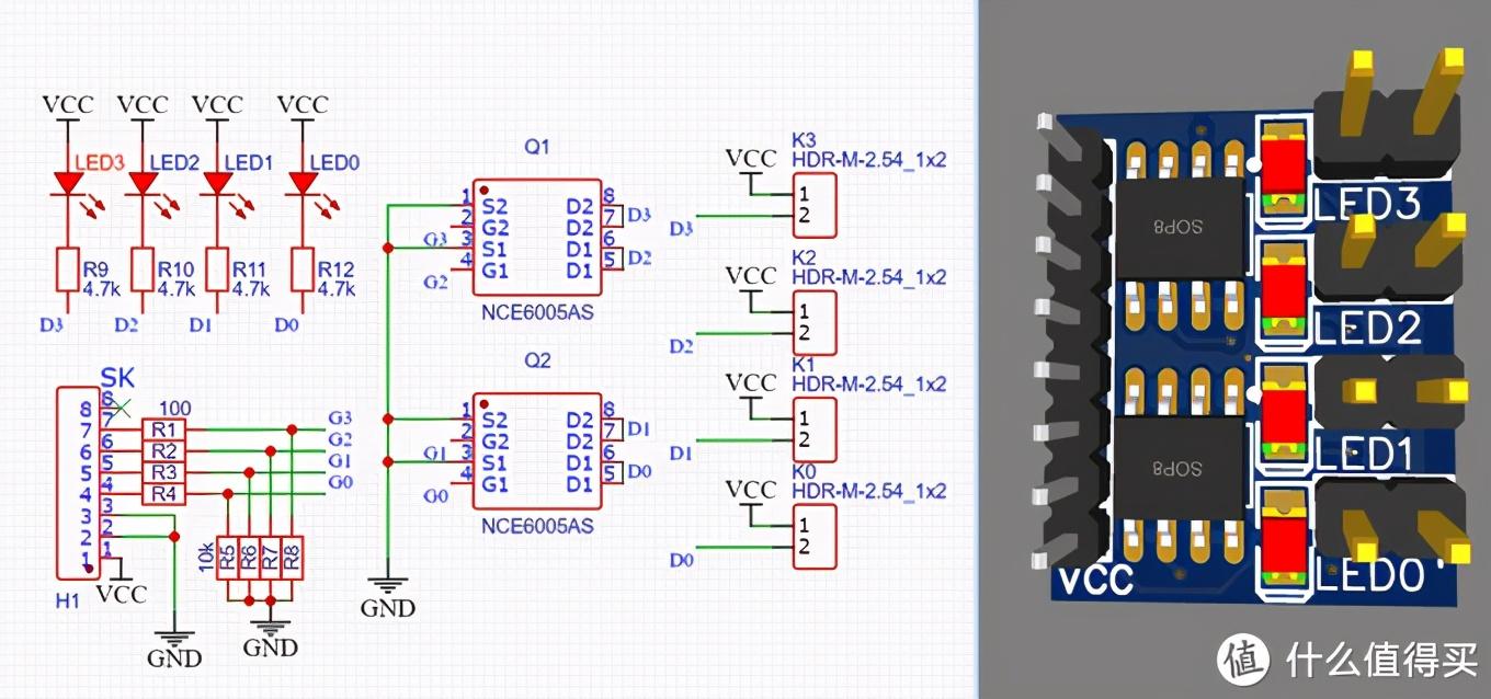 我打算用来无线遥控四路电磁铁,于是设计用 NCE6005 双 MOS 管来增强模块驱动能力,右侧是 PCB 三维预览图,在嘉立创打样后用排针将无线接收模块和 MOS 驱动板焊接到一起,实测使用 3.7V 普通锂电池供电,电机堵转时工作电流可达几百毫安。