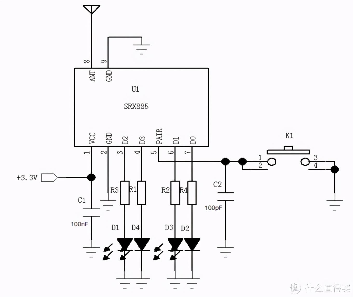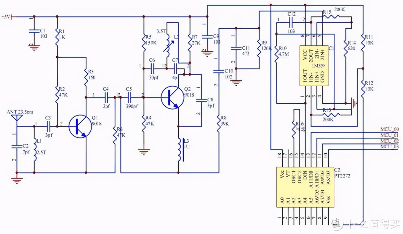 PT2272 接收模块的原理如上图所示,电感 L1 和 L3 用来改变 315Mhz/433Mhz 工作频率,接收到的信号经由运放 LM358 放大后输入 PT2272 的 14 脚,PT2272 再将收到的信号解码,D0-D3 输出相应的电平,超再生接收模块的直接输出电流也是较小的,要增强输出能力可以使用之前提到的三极管或者 MOS 放大电路。