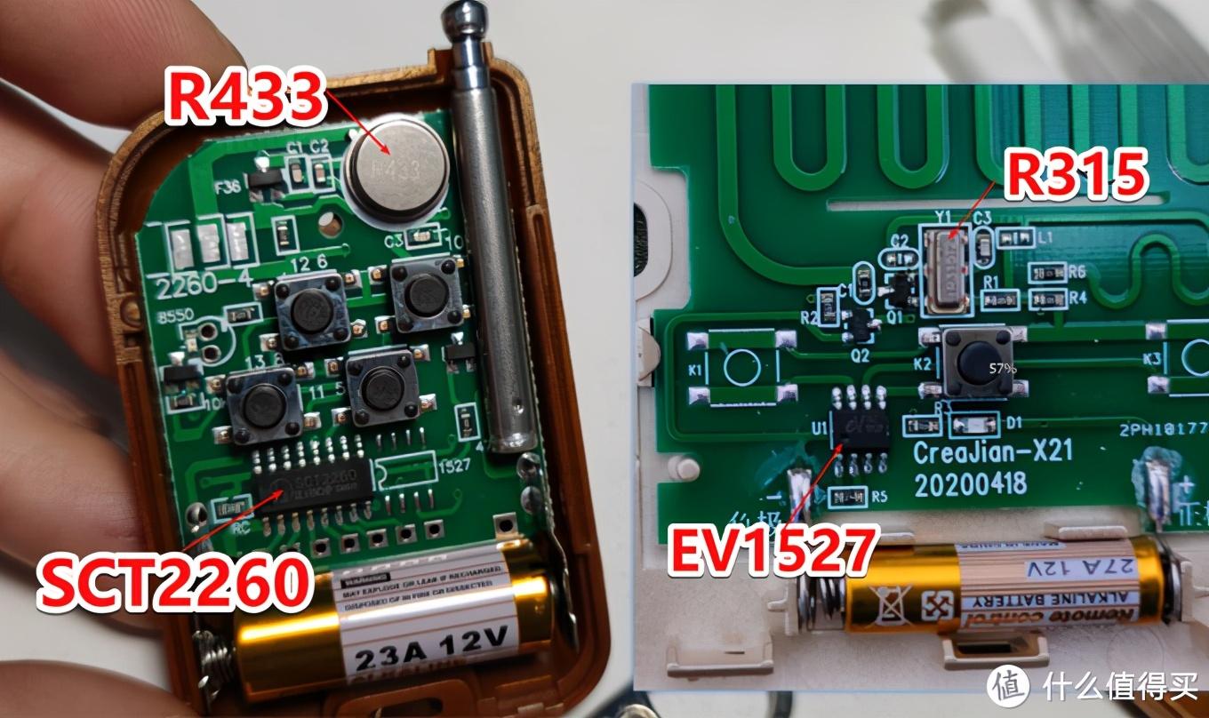 比如上图左边是 433Mhz 的固定码遥控器,右边的是 315Mhz 的学习码遥控器。