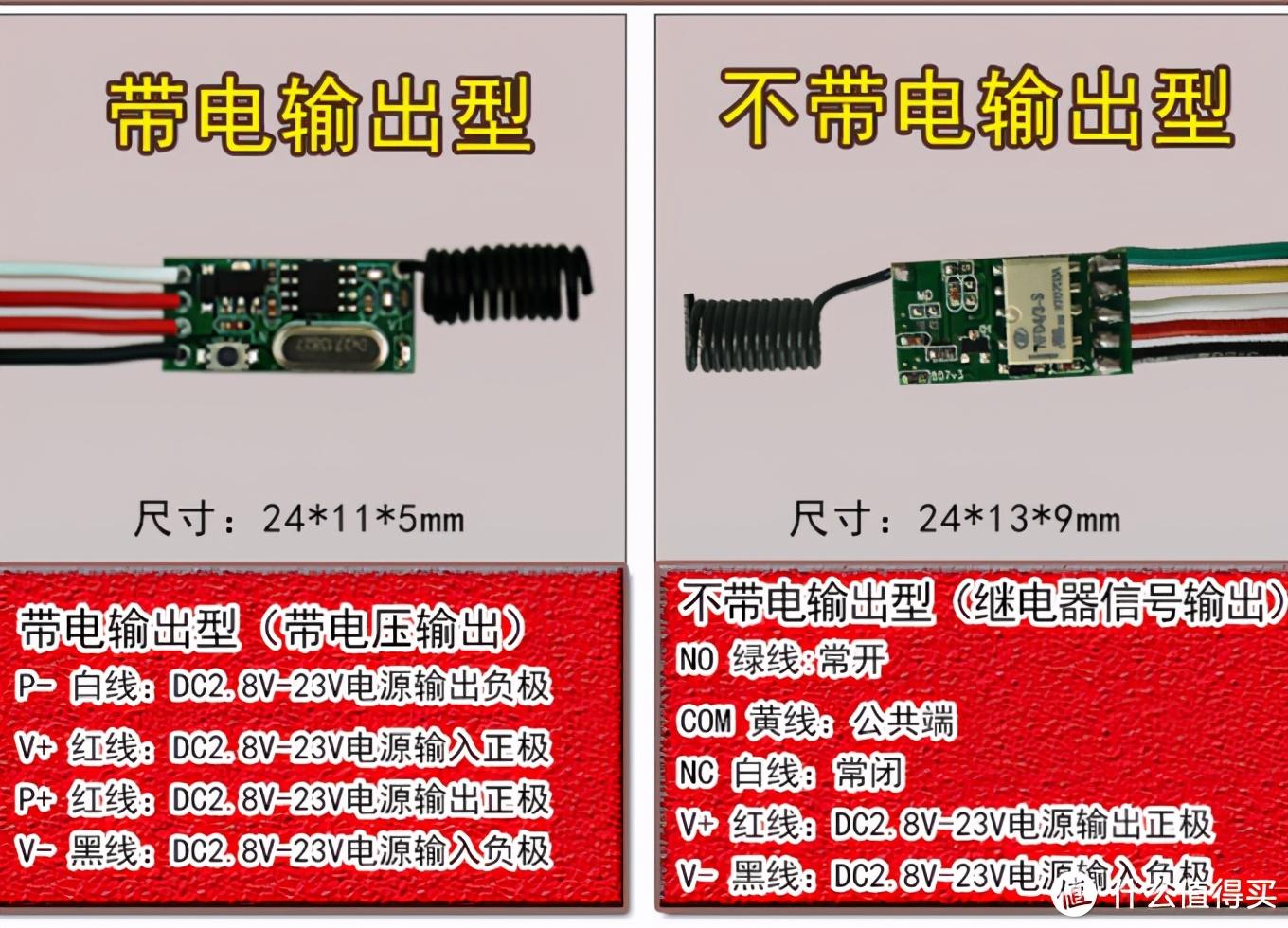 接收模块按输出类型分为带电输出与不带电输出,带电输出意思是输出引脚输出低电平/高电平,输出口的驱动能力较弱,一般不能直接带负载,通常用 MOS 管来增强驱动能力。不带电输出就是在接收模块输出的后级加一个继电器,实际输出引脚为继电器的 NO、COM、NC 脚,在不带电输出模块上飞两根线就可以带电输出了。