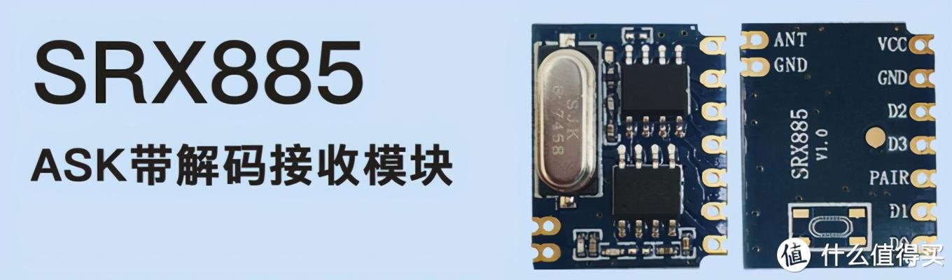 以这款 SRX855 ASK 带解码接收模块为例,ASK 是一种调制方式,带解码意味着无需使用解码芯片二次开发,拿来直接能用,数据手册里说该模块「自动识别和学习 2262、1527、2240 等常用编码方式」,也就是说固定码和学习码的遥控器都可以配对。▲