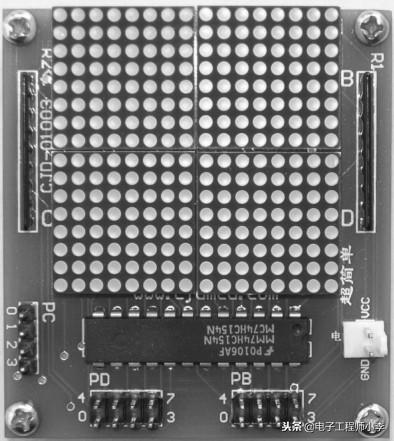 这块板子上的主要元件就是4个8×8LED模块和一只74HC154地址译码器,如图11.6所示。本文不准备详述点阵模块这种发光元件的基本原理,爱好者们可以找到很多相关文章,并参照本文前面的说明自行设计搭建。需要强调的是,要搞清模块的引脚排列,不同厂家的产品并不完全相同。另外要搞清模块是共阴的还是共阳的,这主要决定着地址译码器的选择。