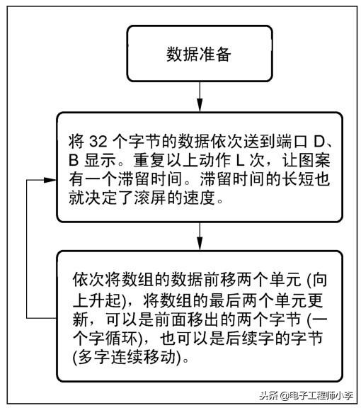 向上滚动时的流程图如图11.8所示,其实现程序在ICC 7平台调试通过。这个小例程使用EEPROM存储汉字点阵信息,主要是作为练习,爱好者也可以使用RAM中的数组省去EEPROM的读动作。