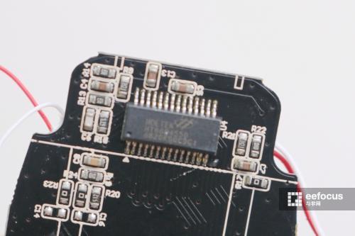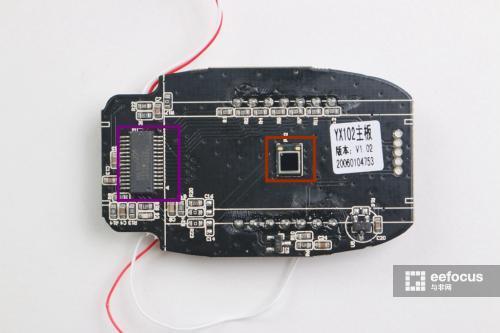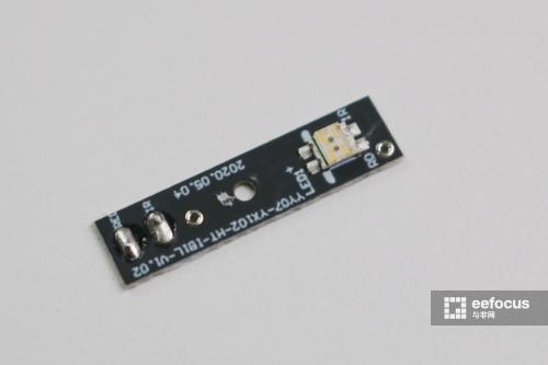 板子的背面(如下图所示)就是相应的接收系统,靠中间的这颗光电转换 IC (咖啡色)实现光信号的采集转换,然后通过电路输出到单片机(紫色)内部;
