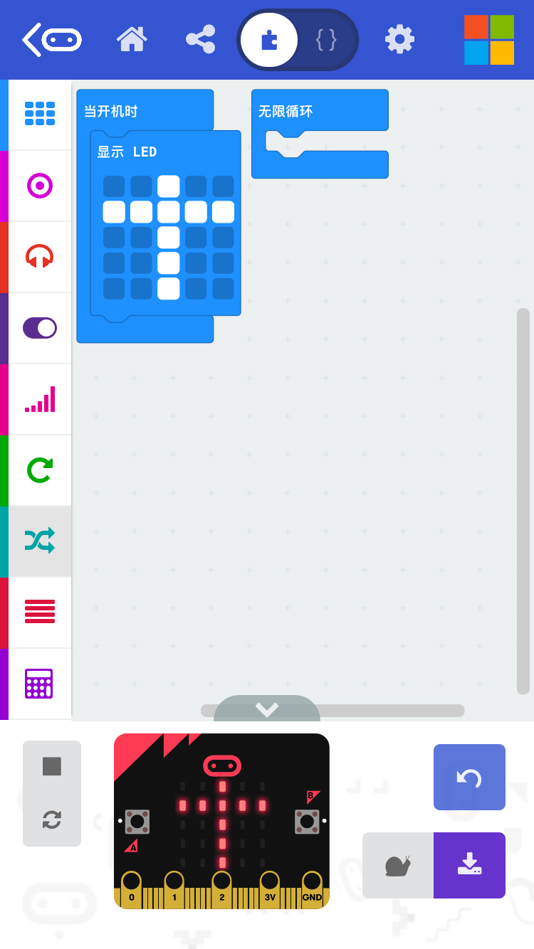 先用图形化编程来让bit的LED矩阵显示一个十字架的图案,直接在屏幕上点击要显示的LED灯就可以了,然后点击下载按钮,用不了几秒钟程序就会被烧录到板子上。