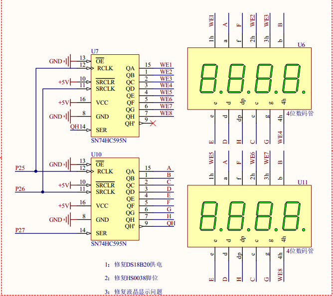 根据原理图可以知道,数码管驱动设计到两个74HC595芯片,一个芯片的输出用于控制数码管的位选,另一个芯片的输出控制数码管的段选,两个芯片的12号引脚同时受单片机的P2.5引脚控制,两个芯片的11号引脚同时受到单片机的P2.6引脚控制,段选数据和位选数据都是通过单片机引脚P2.7发送,在控制时钟引脚P2.6的控制下,当P2.6出现上升沿时,单片机通过P2.7引脚向505芯片内部发送数据,应先发送位选数据,当八位位选数