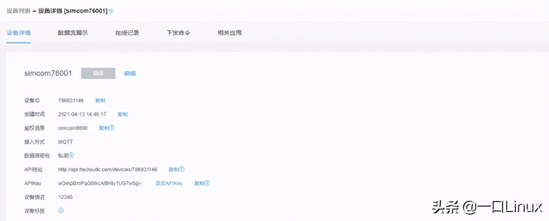 如上图所示,606923821表示设备ID ,PZqqtD0O=5lNOex4NshJn0RLflY= 表示API KEY