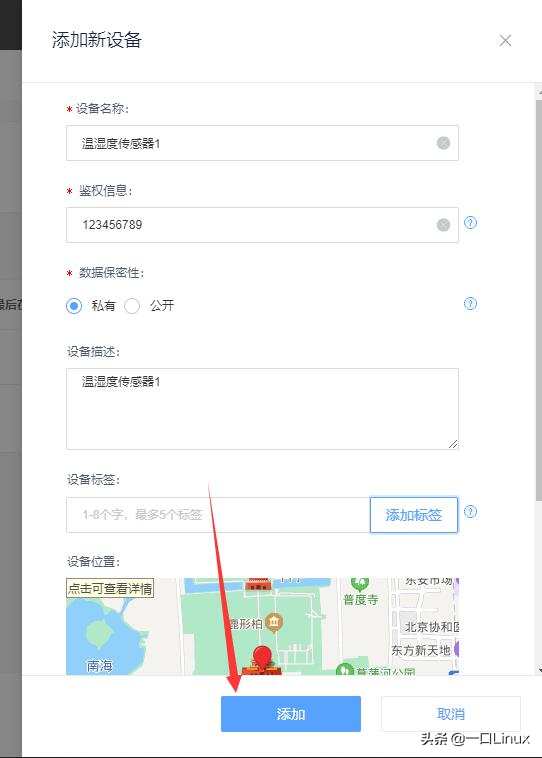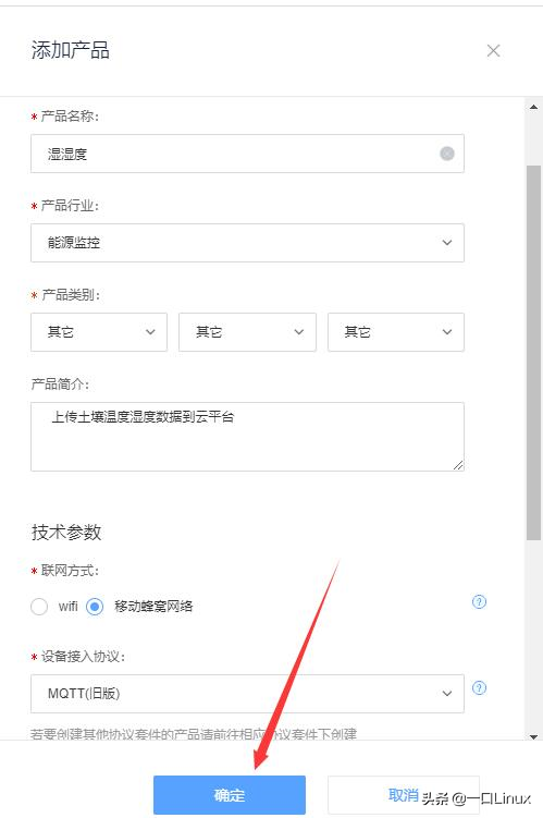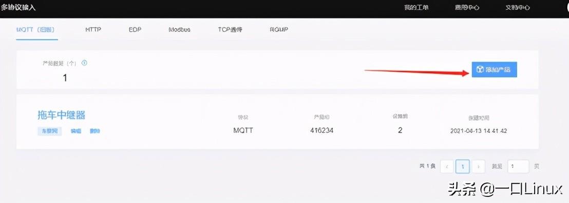 如上图,点击添加产品,onenet平台MQTT协议框架下分为产品ID和设备ID,可以建立多个不同的产品,每个产品拥有不同的设备,设备以ID号进行区分。