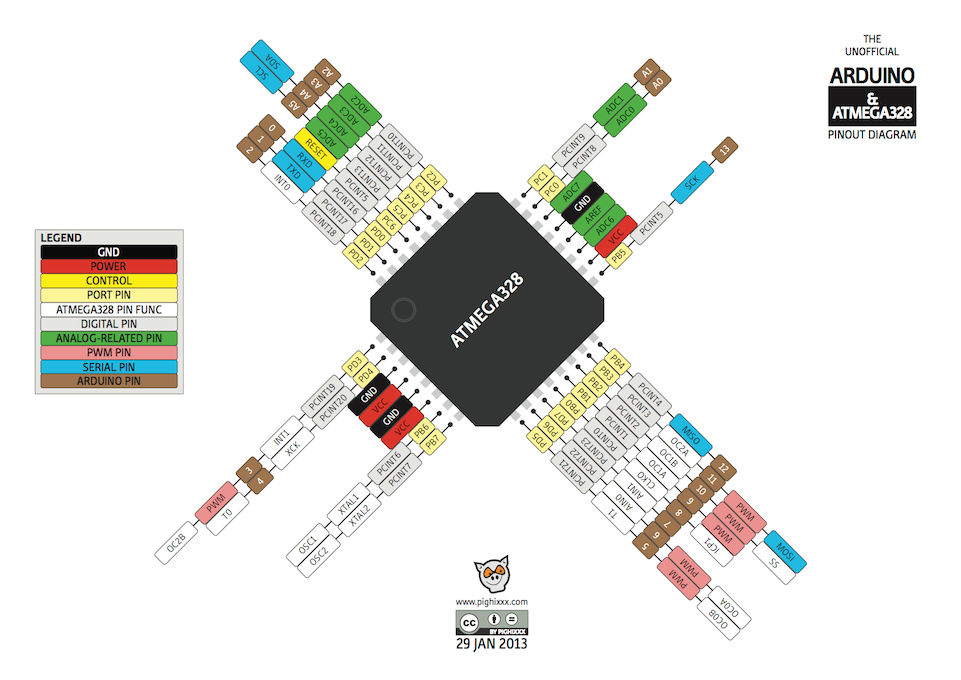 我们可以看到单片机周围排布这金属的针脚,这些针脚叫引脚,下图是ATMEGA328P-AU单片机不同引脚的具体功能,引脚大致可以分为4类:电源、时钟、控制和I/O引脚。
