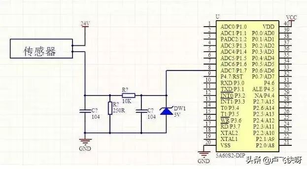 这张图使用一个250欧姆的电阻将4到20mA的电流信号转换成1到5V的电压信号,然后使用一个RC滤波加一个二极管(原谅我模拟电路不好,并不知道是什么意思)接到单片机的AD转换引脚。