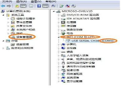 2.右键点击“我的电脑”并单击“管理”,在弹出的窗口中选择“设备管理器”,在点击右边的“端口”,可以看到USB转串口线的COM口(如图为COM3口),记住显示的是COM几口,下载程序时要用到,如下图: