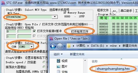 1、在弹出的界面中选择MCU Type为STC89C52RC,单击【打开程序文件】,在你之前Keil保存工程的位置找到以“.hex”后缀的文件,并选择打开,