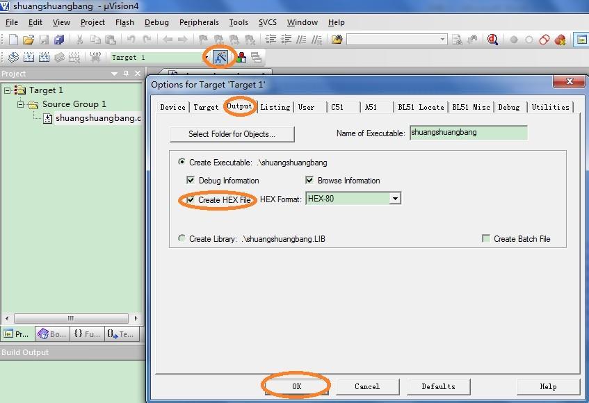 1、生成hex文件: .单击工具栏的【Target Options…】,打开Output选项卡并选择【Creat Hex File】,点击【OK】,这时编译完成后才会产生可供下载到单片机的Hex文件,如下图: