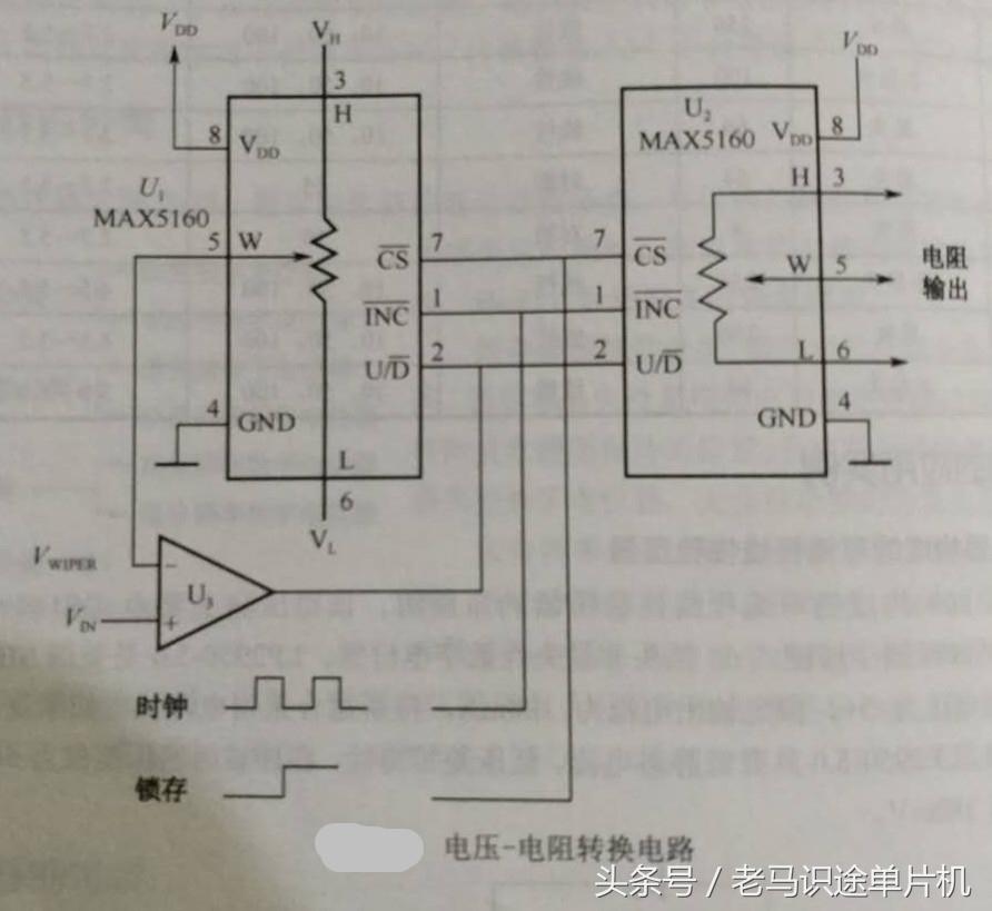 下图是电压-电阻转换电路,它是由两只MAX5160数字电位器共同来完成的。数字电位器U1和比较器U3构成数字式跟踪-保持电路,U1通过调节内部分压来保证VWIPER跟踪VIN,这样,滑动电阻将于VIN成正比,由于U1和U2的数字输入是连在一起的,因此U2的滑动端位置与U1相同,对应端之间的电阻也相同,从而得到与VIN成正比的电阻,实现了电压到电阻的转换。