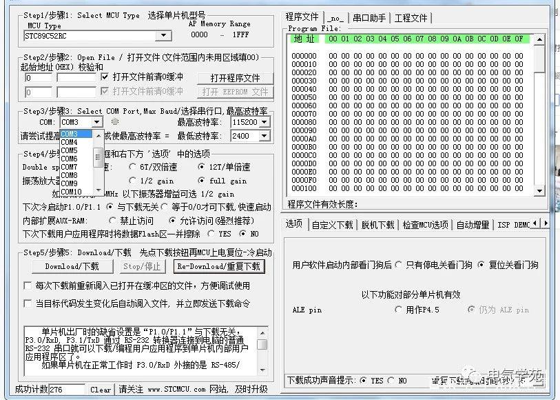 选择COM口,这个是为了让下载器与软件进行对接,务必选择正确,否则无法使用,学过其他编程的,应该都清楚这项。很重要。