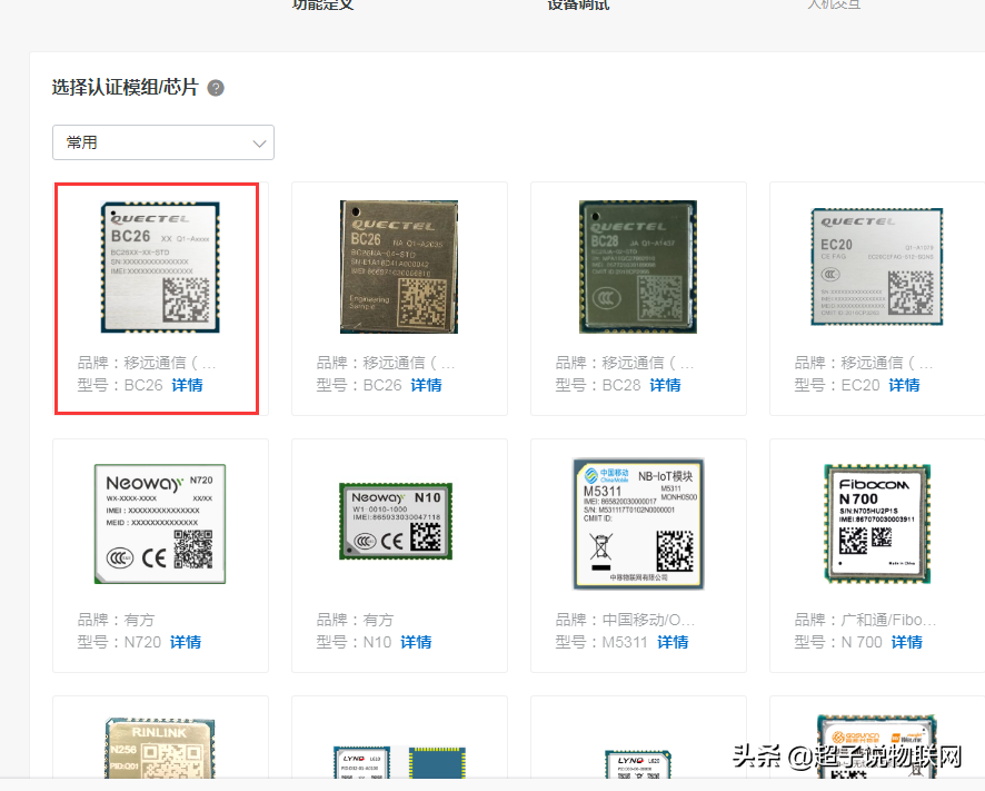 我们新建设备的时候,为了跳过配网协议,所以故意选择了蜂窝的连接方式,所以我们随便选一个通过认证的模组就行,选哪个型号都不会影响我们的DIY设计。