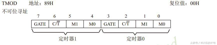 TCON为定时器T0和T1的控制寄存器,可以位寻址(直接操作位);TMOD是T0、T1工作方式控制寄存器,不可以位寻址(只能操作寄存器),高四位控制T1,低四位控制T0;定时器的工作方式由TOMD寄存器中的M1和M0选择,具体如上图。