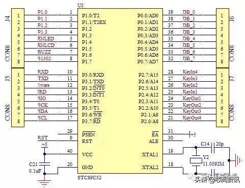 在这里我们还要介绍一下如何使用 KST-51 单片机开发板进行外围扩展实验。我们的开发板只能把基本的功能给同学们做出来提供实验练习,但是同学们学习的脚步不应该停留在这个实验板上。如果想进行更多的实验,就可以通过单片机开发板的扩展接口进行扩展实验。大家可以看到蓝绿色的单片机座周围有 32 个插针,这 32 个插针就是把单片机的 32 个 IO 引脚全部都引出来了。在原理图上体现出来的就是 J4、J5、J6、J7 这 4 个器件,如图 18-2 所示。