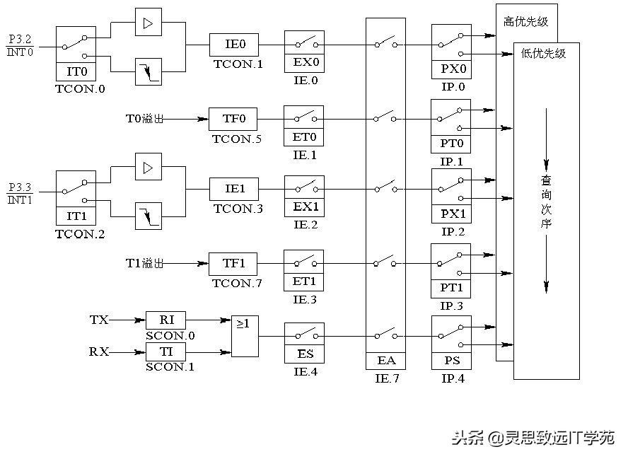 AT89C51具有五个中断源,分为内部中断源和外部中断源。外部中断源有两个,通常指由外部设备发出中断请求信号,从P3.2和P3.3 引脚输入单片机,用电平或边沿触发两种方式申请中断。 内部中断源有三个,两个定时器/计数器(T0,T1)中断源和一个串行口中断源,T0和T1的中断申请是在它们计数从全“1”变为全“0”溢出时自动向中断系统提出的。