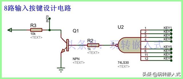 8个按键作为74LS30的输入,输出通过NPN三极管接入51单片机的外部中断0接口,以中断的方式实现按键功能的检测,单片机的中断资源为低电平有效,为了提高电路稳定性在三极管的集电极上加入上拉电阻,以防误动作。
